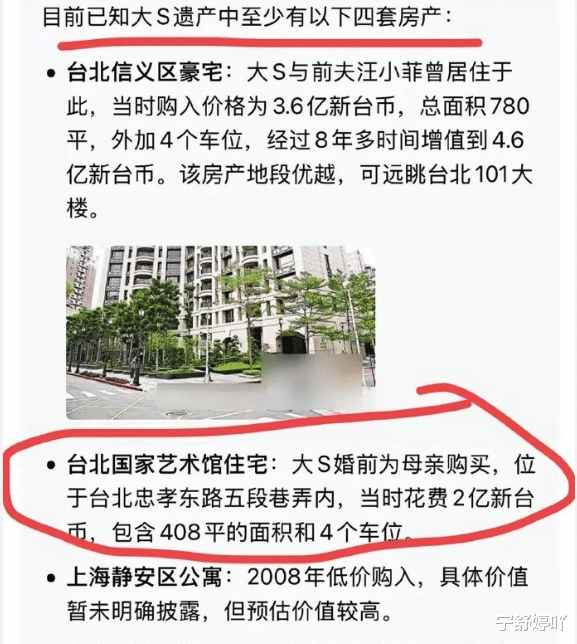 更戏剧化的是,大S母亲黄春梅突然公开2008年的房产赠予协议,要求收回女儿名下四套豪宅。